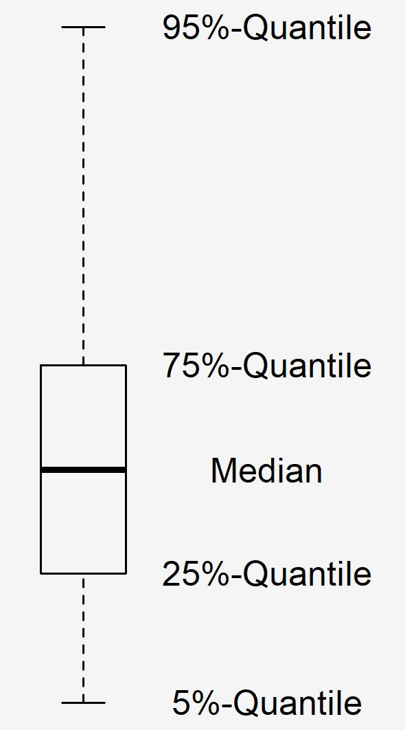 Die Darstellung zeigt die Anteile der bei der 6-Wochen-Vorhersage verwendeten Quantile. Ausreißer werden nicht dargestellt. Es liegen 5 % aller Ensemblemitglieder oberhalb des 95%-Quantils und 5 % unterhalb des 5%-Quantils, also außerhalb des Boxplot-Bereichs. Für die Vorhersage bedeutet das: Mit 50%iger Wahrscheinlichkeit liegt der zukünftige Wochenmittelwert innerhalb der Box und mit 90%iger Wahrscheinlichkeit liegt er innerhalb der Antennen. Genauere Informationen zu Boxplots im Allgemeinen finden Sie hier (externer Link).